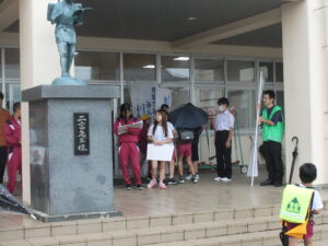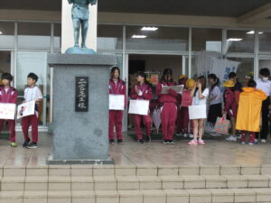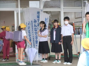 新湊南部中学校の生徒やPTA役員の方々に来ていただき、あいさつ運動を行いました。本校の生活代表委員も加わり、元気な挨拶の声が玄関前に響き渡りました。