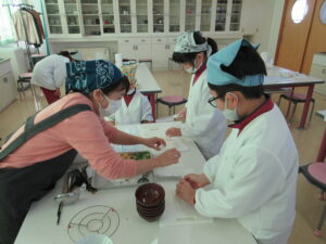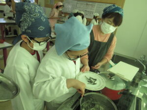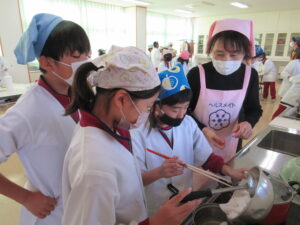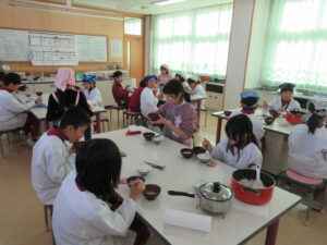 5年生が家庭科で調理実習を行いました。伝統的な日常食である「ご飯と味噌汁」を作って食べました。ご飯は鍋で炊き、米の色の変化や炊き上がる香りに注目しながら調理しました。お味噌汁は、煮干しでだしをとりました。だしなしの味噌汁も用意し、風味やうま味の違いを感じることができました。米は自分たちで田植えや稲刈りをしたコシヒカリだったので、より一層おいしく感じました。塚原っ子応援隊の方々のサポートもあり、安全に楽しく調理して食べることができました。