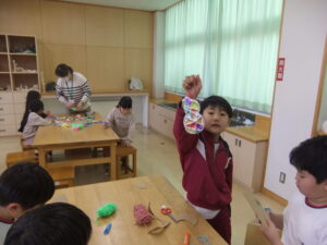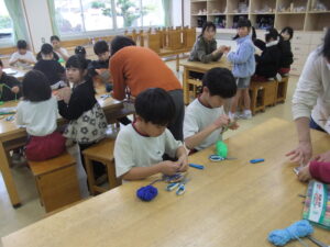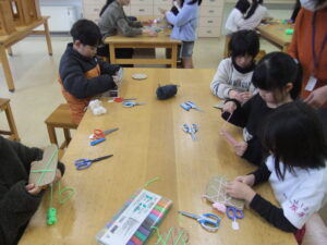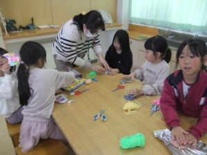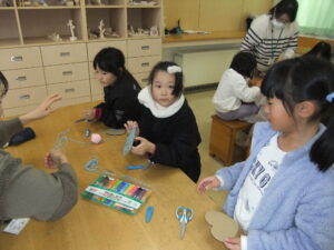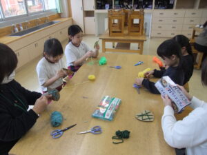 2学期最後のつやつやサークルは、クリスマスオーナメント作りでした。長靴や雪だるまをかたどった段ボールに毛糸を巻き付け、アルミホイルで包みました。アルミホイルで包んだものにマジックでカラフルに色づけして、すてきなクリスマスオーナメントができあがりました。