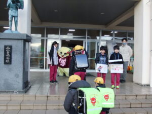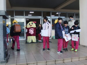 また、生活・代表委員会の子供たちもあいさつ運動に参加しました。今日は、塚原小学校のマスコット、「つかっしー」もあいさつ運動に参加しました。