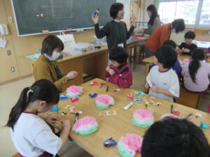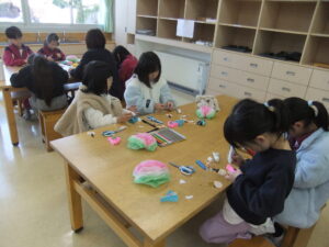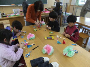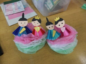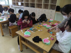 今日のつやつやサークルはフラワーひな飾りづくりでした。カラフルな花紙の上に、折り紙で作ったお内裏様とお雛様を飾り、すてきなひな飾りが出来上がりました。