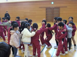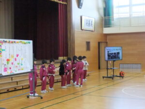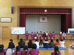 1年生が、来年度、入学してくる園児を招待し集会を行いました。1年生の子供たちは、小学校での生活を紹介したり、この1年間でできるようになったことを披露したりしました。なわとびや音読、鍵盤ハーモニカの演奏、けん玉、たし算、引き算、校歌の斉唱等、自分の得意なことを紹介しました。