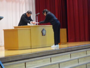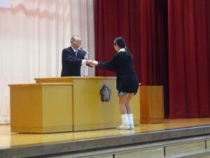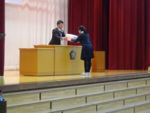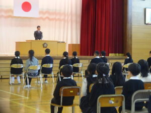 また、同窓会入会式に引き続き、令和7年度卒業生から、卒業記念品として、日本昔話全集DVD(10巻)を寄贈していただきました。来年度より寄贈していただいた日本昔話全集DVD(10巻)は、毎週1回、給食時に放送する予定です。大切に使っていきたいと思います。どうもありがとうございました。