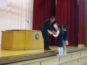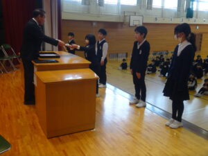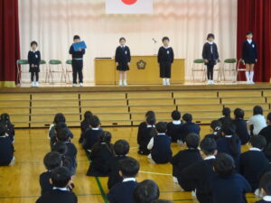 各学年の代表者による3学期にがんばったことの発表があった後、令和7年度の修了式をしました。その後、生徒指導の先生から春休みの過ごし方についてのお話を聞きました。