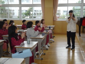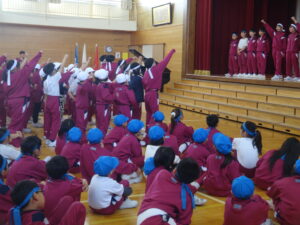 朝の活動では、6年生が1年生に校歌を教えています。