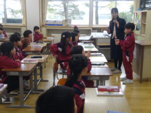 2年教室では、算数の学習プリントに取り組み、終わった子が「ますりん」(教科書に出てくるキャラクター)のイラストを描いていました。