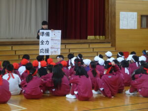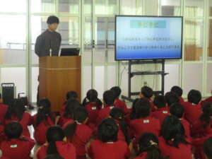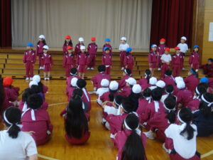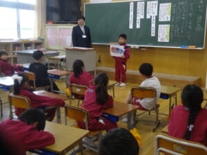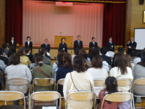 6年生からは、歓迎の言葉があり、塚原小学校の1年間の様子や、「ハキハキ・ニコニコ・キビキビ」の行動目標についての話がありました。