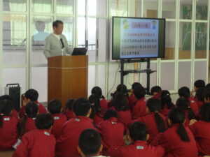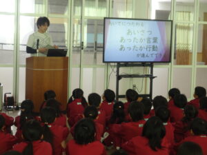 朝の活動の時間、先生方から「ニコニコ(知)・ハキハキ(徳)・キビキビ(体)」の具体的な目標と取組について、子供たちに伝えました。