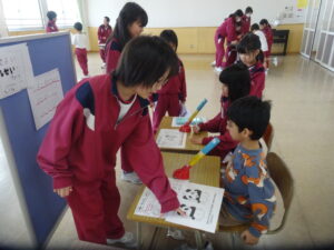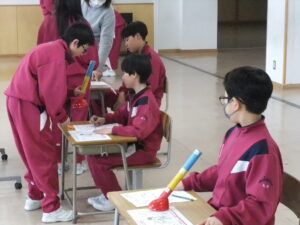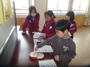 4~6年生の保健委員会の子供たちが、楽しく健康についての知識を深めようと「けんこうビンゴ」という企画しました。歯磨きの力加減を実際に体験するコーナーや約30cm離れて字を書く時の姿勢を体験するコーナー等があり、楽しそうに体験していました。24日は低学年、25日は高学年、26日は中学年が対象の日です。