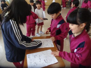朝の時間を利用して、あったかクラスを行いました。今回のあったかクラスは、各クラスごとではなく、低・中・高学年ごとに行うことにしました。今日は、低学年と高学年が行いました。先生が考えたアクティビティを行い、楽しそうに活動していました。中学年は、26日に行う予定です。