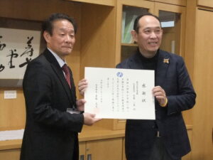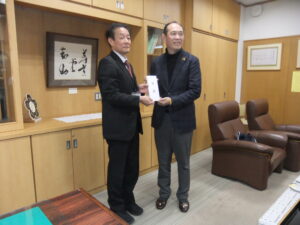 本校が来年度、創校150周年を迎えるにあたり、地元の株式会社荒木運輸、代表取締役社長の荒木 一義 様から150周年記念事業で使ってほしいと100万円の寄附金をいただきました。校長室にて、射水市教育委員会の方も臨席した中、荒木 一義 様より校長に目録が渡されました。