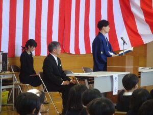 塚原小学校同窓会入会式が行われました。卒業生代表が誓いの言葉を述べるとともに、記念品を受け取りました。同窓会長様から歓迎のお言葉もいただきました。