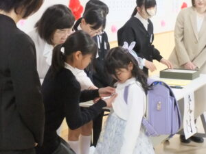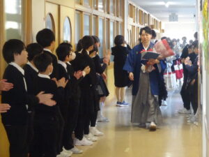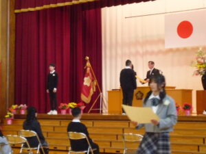 PTAの方からは、卒業生に卒業証書を入れるフォルダーと卒業式に渡されるコサージュ、一輪の花をいただきました。また、全校児童に紅白餅が配られます。あわせて深く感謝申し上げます。
