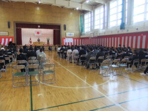 各学年の代表者による3学期にがんばったことの発表があった後、令和7年度の修了式をしました。その後、生徒指導の先生から春休みの過ごし方についてのお話を聞きました。