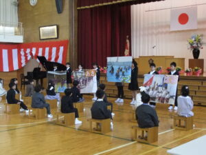 また、同窓会入会式に引き続き、令和7年度卒業生から、卒業記念品として、日本昔話全集DVD(10巻)を寄贈していただきました。来年度より寄贈していただいた日本昔話全集DVD(10巻)は、毎週1回、給食時に放送する予定です。大切に使っていきたいと思います。どうもありがとうございました。